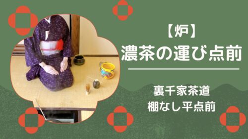 裏千家茶道、炉の濃茶点前(棚なし運びの平点前)のお稽古です。茶道初心者にもわかりやすいよう、写真多めでご紹介しています。続きを読む>>>