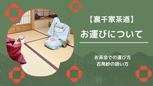 裏千家のお茶会でのお運びに使う古帛紗の扱い方について。お茶を出す・下げる手順、丁寧な所作のコツをまとめました。>>>続きを読む